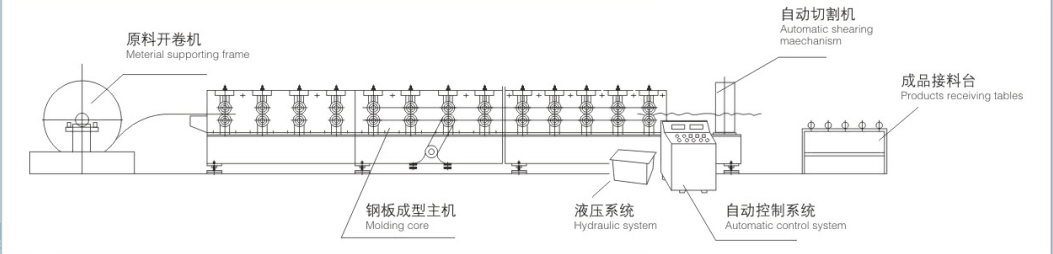 经该机辊轧成型的压型板属咬口屋面板,具有波峰高、强度大、无螺钉锁边咬口安装,搭接安装安全可靠,防水抗台防暴性能强等特点,而且生产自动化程度高,成本低廉,经久耐用,重量轻,拼装组合自由方便。